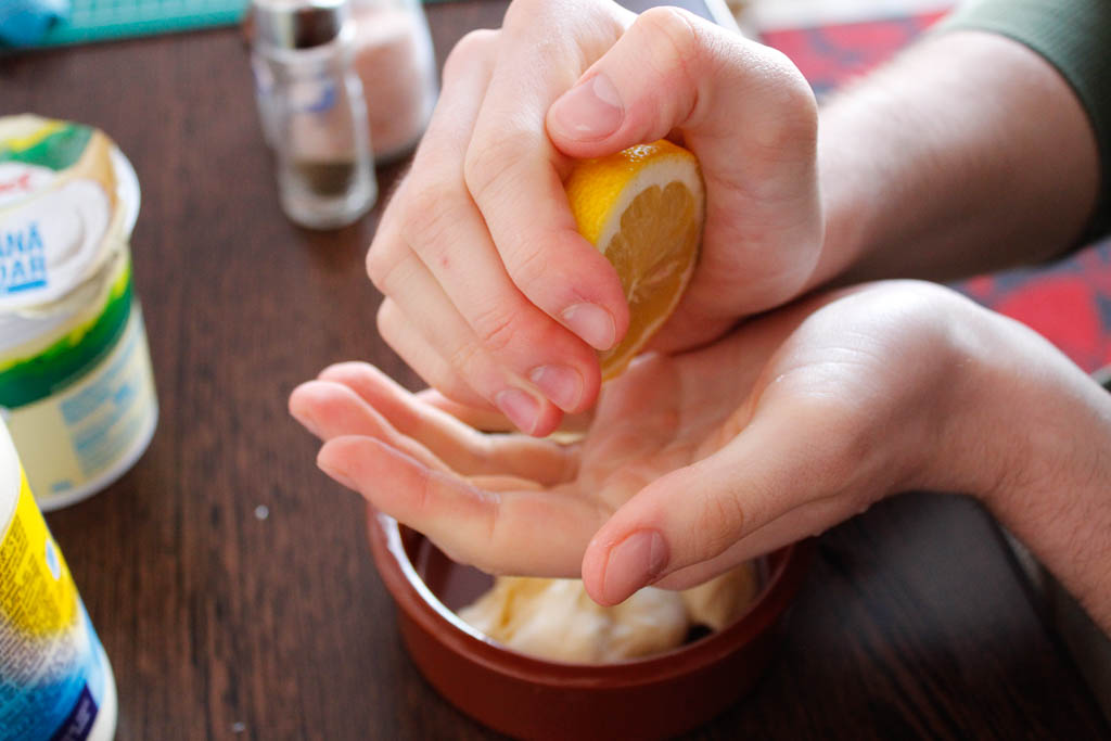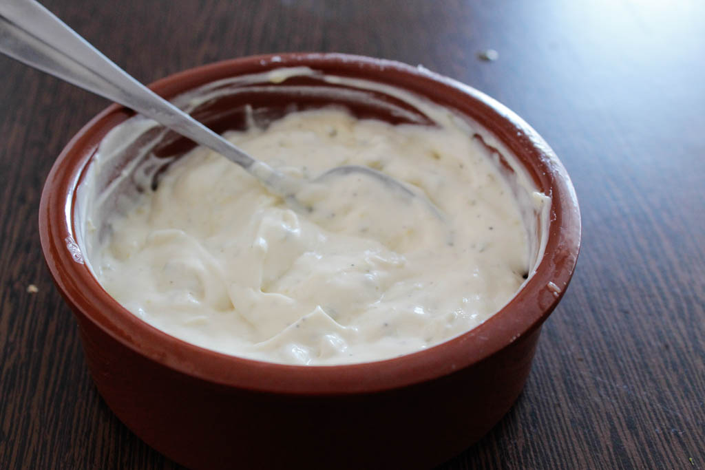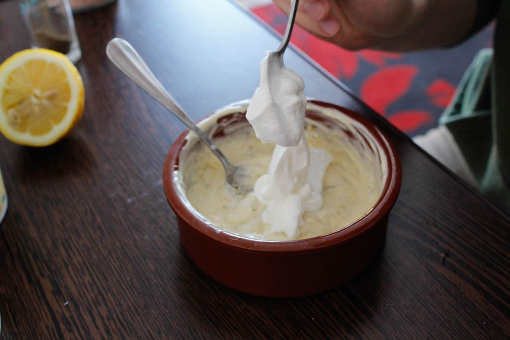 2. Mix together well the mayonnaise, sour cream and mustard.