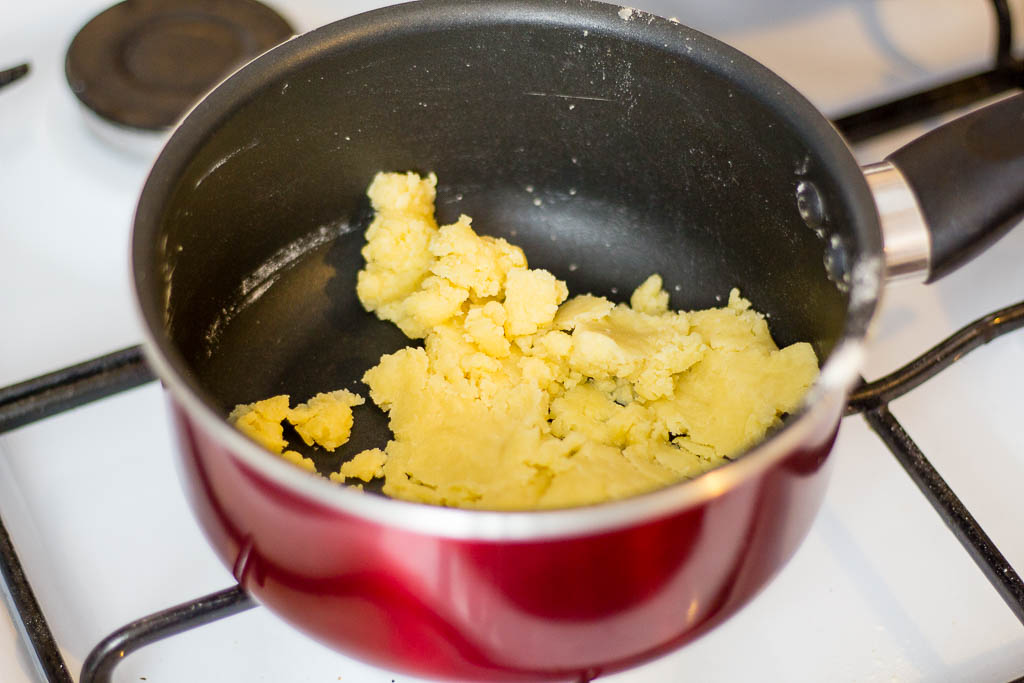 - Once the butter is completely melted, add the flour and mix it well until you get a mixture similar to a soft dough. Cook this mixture for a minute of two to cook the flour (your sauce will taste like flour otherwise).