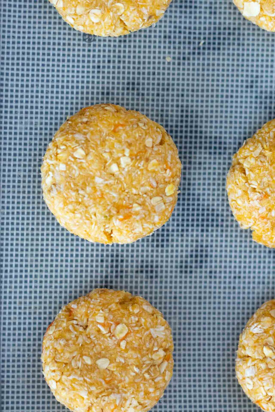 These biscuits won’t spread while baking. The baking soda will prevent that and will hold them together, giving the pumpkin Anzac biscuits they signature crunchiness.