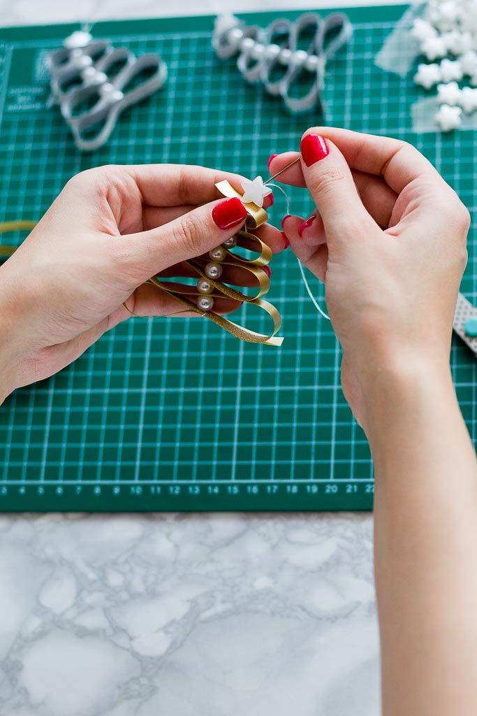 It was quite a process, the first two ornaments were such a pain – four hands weren’t enough to keep the ribbon and beads together, but luckily I found a better way to do it. Let’s hope I can explain it well enough for you too.